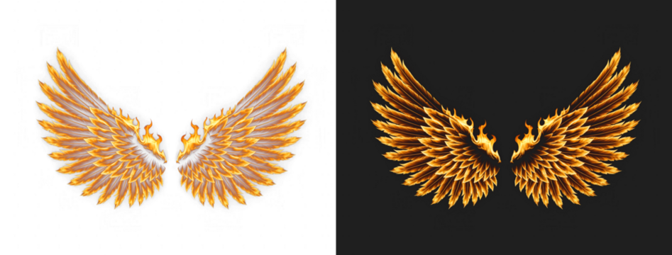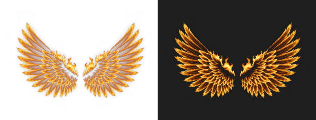 Inferno feather wings icon spread wide on a solid field for logo marks and tattoo projects, esport team crest and album cover art with open area for wording and headline placement plus caption line