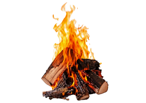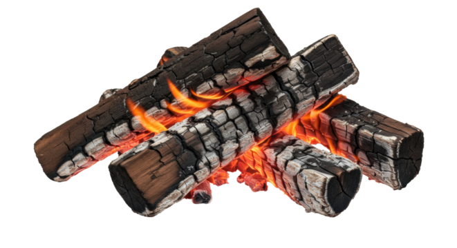 Realistic gas fireplace logs with glowing embers and flames isolated on transparent background