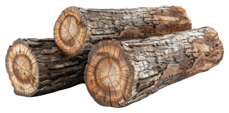 Stack of rustic wooden logs isolated on white background, perfect for firewood, construction, and natural decor projects.