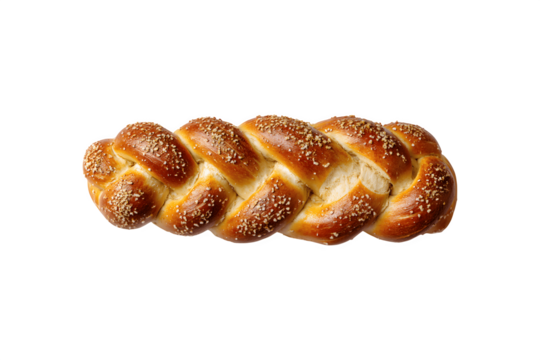 Three different types of bread a rustic round loaf a long crusty baguette and a sweet bun with a braided top freshly baked and displayed on a white background