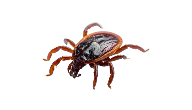 A small, round dust mite with long legs and fine hairs on its body, captured under the lens of an electron microscope isolated on a transparent background