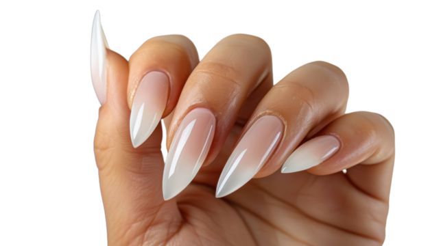 Woman showing long almond shaped acrylic nails with ombre french manicure on transparent background