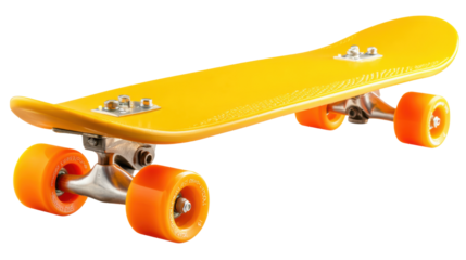 Yellow skateboard with orange wheels extreme sport urban lifestyle skating equipment modern youth street culture concept professional studio isolated on white background