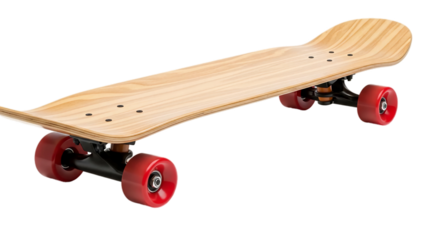 Vintage wooden skateboard with cream wheels on a transparent background, representing retro sports, youth culture, and outdoor activity