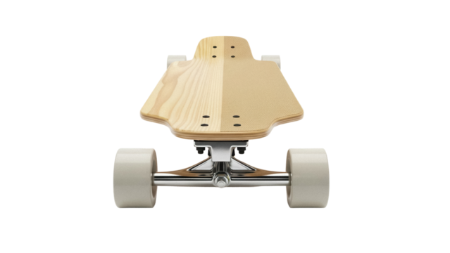 Longboard skateboard isolated PNG on transparent background, wooden deck with grip tape and white wheels for extreme sports and recreation