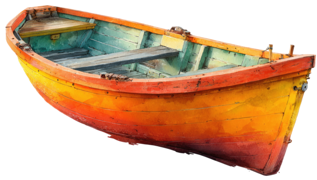 Vibrant, weathered rowboat, side view, showcasing painted wooden planks and a rustic, textured feel