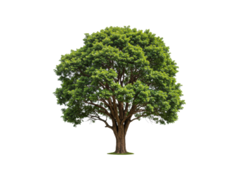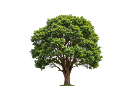 Majestic, robust deciduous tree with gnarled brown trunk, spreading branches, dense green foliage, centered on transparent, concept of enduring success
