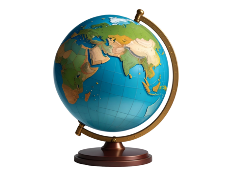 A stylized 3d globe showing continents and longitude lines on a transparent background
