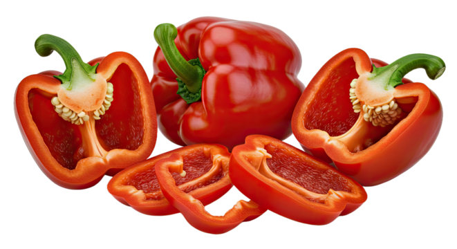 PNG Red bell peppers and longitudinal slices of pepper, isolated on white background