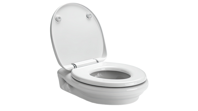 White ceramic toilet with the lid open against a plain black background on transparent background