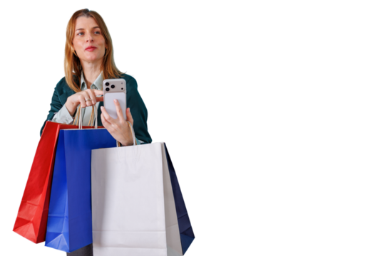 Woman standing, holding multicolored shopping bags and checking her smartphone, looking away. Transparent background