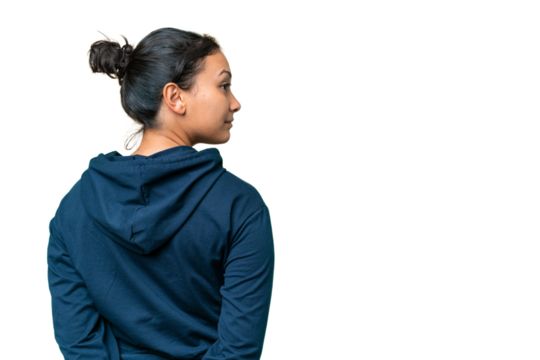 Young Uruguayan woman over isolated chroma key background in back position and looking back