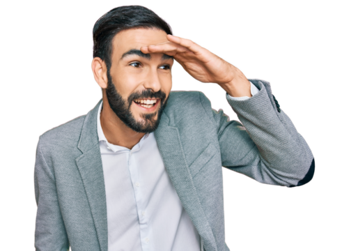 Young hispanic man wearing business clothes very happy and smiling looking far away with hand over head. searching concept.