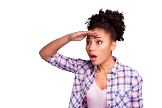 Young Latin friends in studio looking far away keeping hand on forehead.