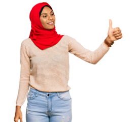 Young african american woman wearing traditional islamic hijab scarf looking proud, smiling doing thumbs up gesture to the side