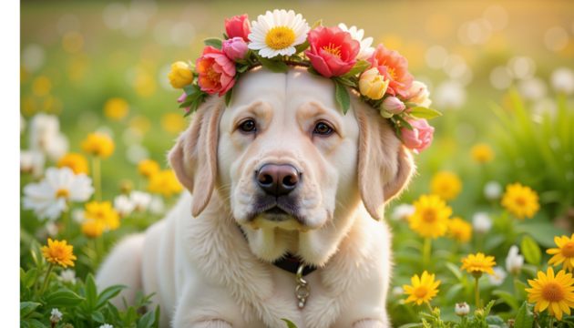 Dog wearing a flower garland looking serene lying in a field of flowers on a sunny day