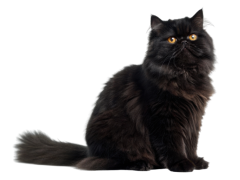 Black Persian cat with long fluffy fur and bright amber eyes sitting calmly looking upward with soft and elegant expression