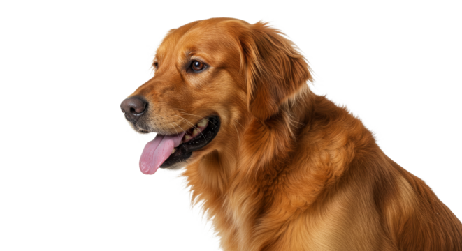 Close-up portrait of a handsome man with a happy smile looking to the left sideways in studio, isolated on white background