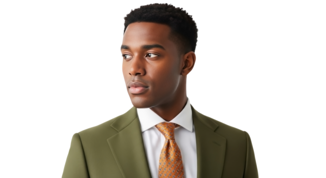 Professional young black man wearing a stylish olive green suit and orange tie looking to the side isolated on transparent background