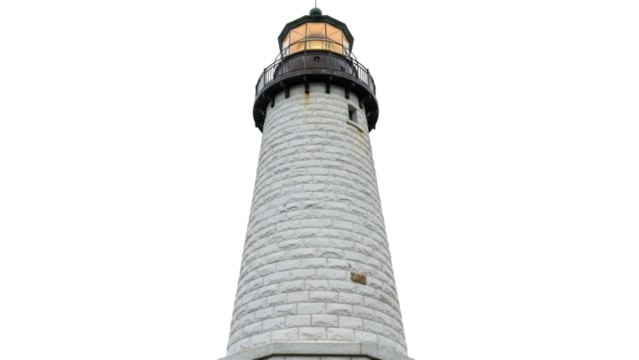 Isolated stone lighthouse, illuminated lantern room atop a tower, no people, scenic lookout