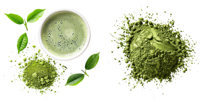 A cup of frothy matcha green tea powder with loose green tea leaves and a pile of finely ground matcha powder.