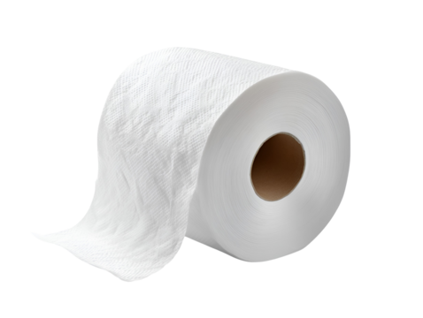 A single roll of white toilet paper with a loose sheet hanging down isolated on transparent background