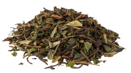 Heap of dry green tea leaves isolated on transparent background, ready to brew a cup of aromatic beverage for relaxation and refreshment