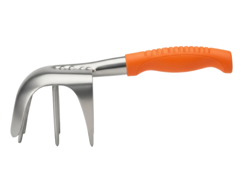 Isolated garden tool for loosening and aerating soil with orange handle for grip and comfort