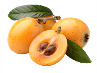 Fresh ripe loquats fruit with green leaves and seeds isolated on transparent background