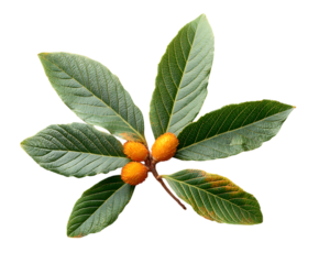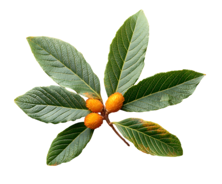 Ripe yellow loquat fruits with green leaves on branch, isolated on white transparent background. Concept of fresh organic tropical fruit