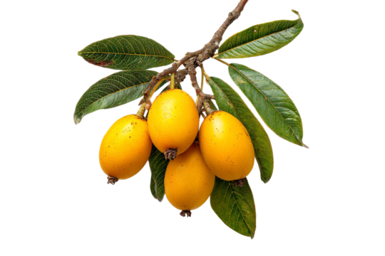 Ripe yellow loquat fruits with green leaves on branch, isolated on white transparent background. Concept of fresh organic tropical fruit