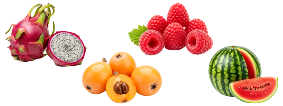 Assortment of fresh fruits including dragon fruit, raspberry, loquat, and watermelon.