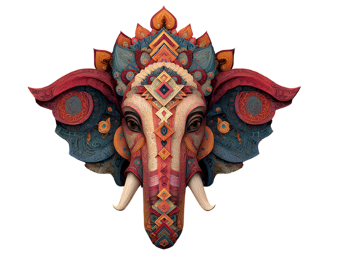 Top-Down Stylized Lord Ganesha Head with Geometric Patterns and Vibrant Color Palette, Overhead Perspective, Isolated on Transparent Background