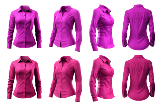 2 Set of woman magenta purple pink button up long sleeve collar slim fitting shirt front, back side view on transparent background cutout, PNG file. Mockup template for artwork graphic design