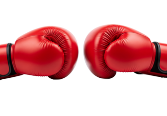 Pair of bright red boxing gloves facing each other ready for a fight isolated on transparent background