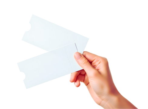 A persons hand is holding three blank white cards or tickets fanned out against a transparent background