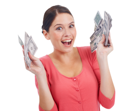 Cash, money and a woman excited for win, investment growth and finance. Winner, dollars and happy female person portrait with lotto prize, profit or giveaway isolated on transparent, png background