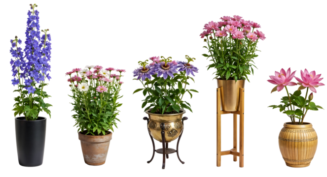 Set of various Houseplants: Delphinium, Daisy, Passionflower, Lotus isolated on transparent background