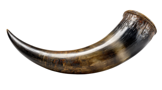 Drinking horn made from a bull horn, a traditional vessel for feasts and rituals, showing rustic texture on transparent background