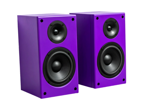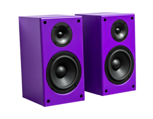 Two purple boxy loudspeakers are positioned closely, featuring round black drivers against a solid black background