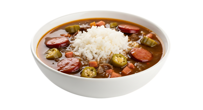 Hearty bowl of gumbo with rice sausage and okra, isolated on a transparent background, cutout, PNG