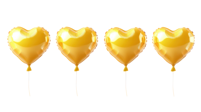 Four golden heart balloons isolated on transparent background