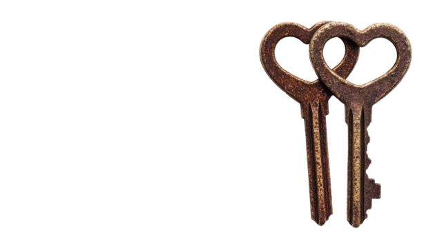 Pair of vintage heart shaped keys, love concept, antique romance, cut out transparent