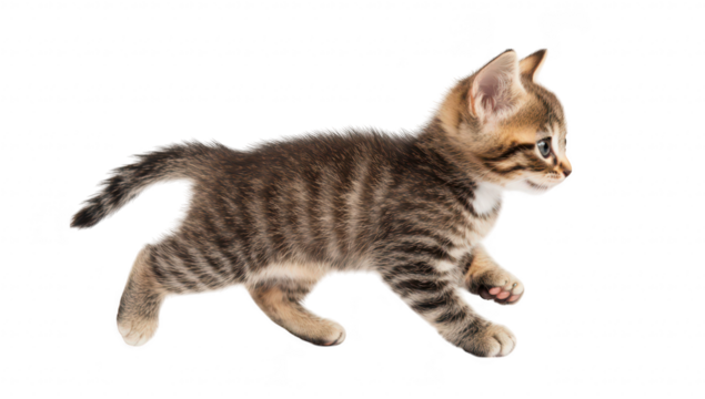 A playful tabby kitten trots gracefully across a bright white background. capturing the joy of youth and curiosity. ideal for pet-themed projects and advertising
