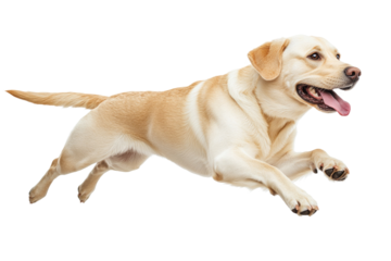 Happy Labrador Retriever leaps joyfully indoors showcasing playful energy and excitement