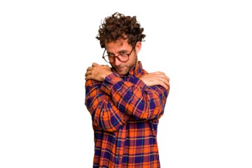 Young curly smart caucasian man cut out isolated hugs, smiling carefree and happy.