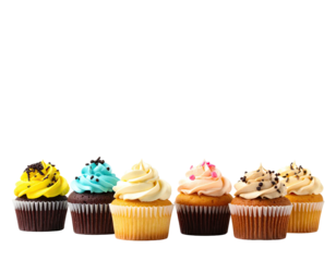 A row of colorful frosted cupcakes sits against a blank backdrop