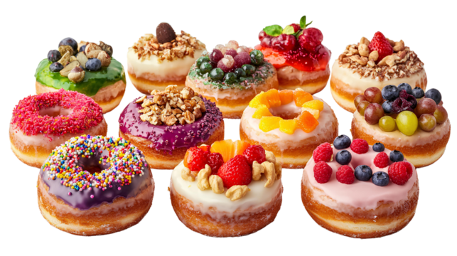 Colorful Variety of Delicious Donuts with Toppings and Sprinkles Perfect for Dessert Lovers, Sweet Treats, and Celebrations in a Fun and Playful Arrangement