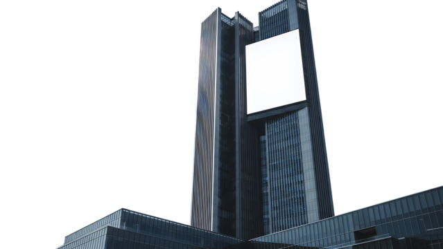 Modern skyscraper with blank billboard isolated on transparent background viewed from low angle