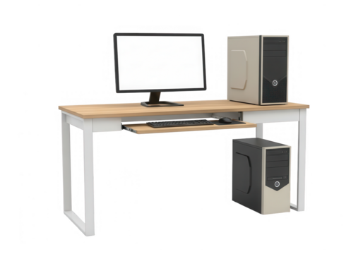 A computer workstation with a monitor, keyboard, and two tower cases is isolated on transparent background
